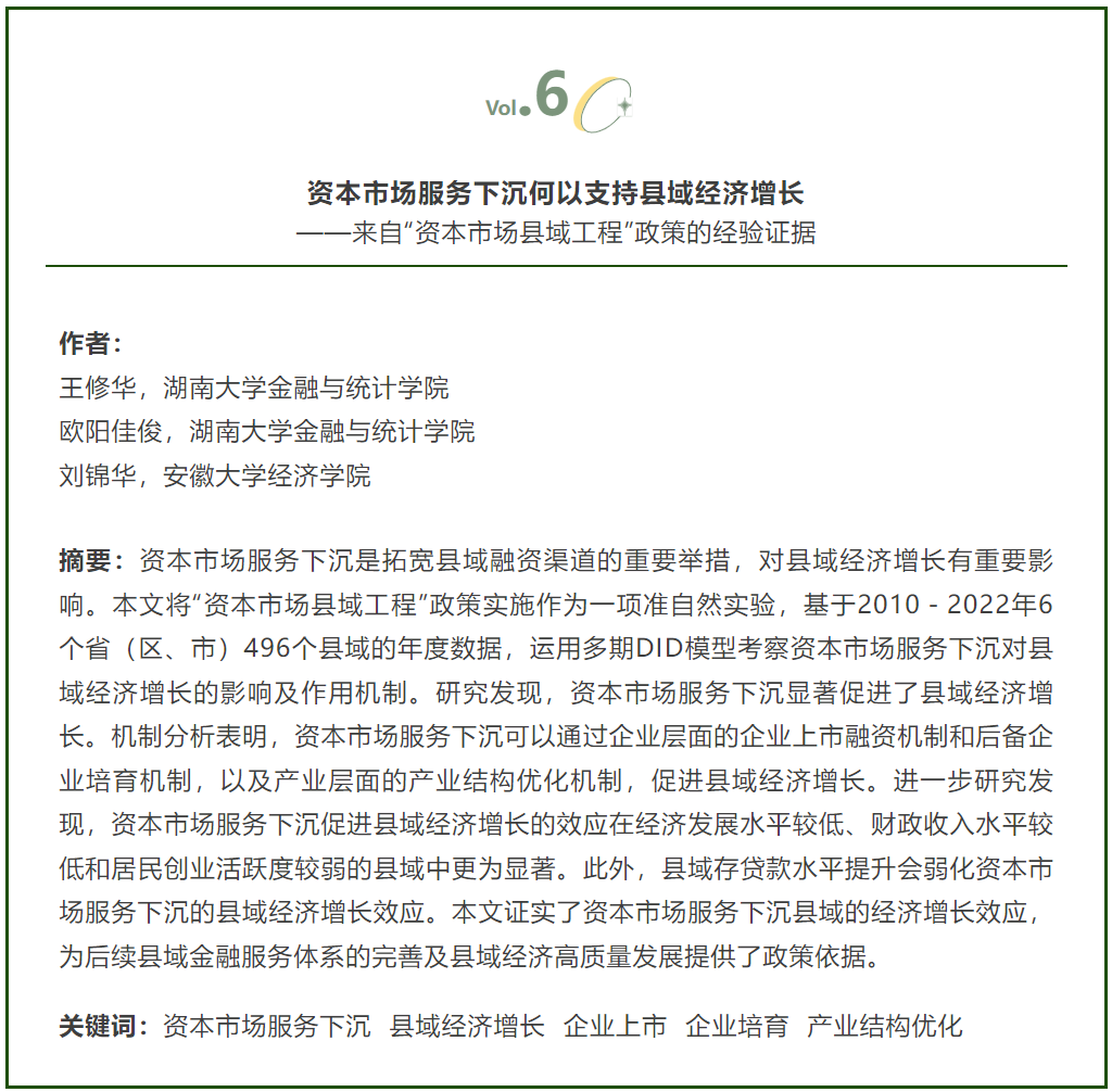 近日,91吃瓜 应用金融系王修华教授,和2022级博士研究生欧阳佳俊、安徽大学经济学院刘锦华老师(原91吃瓜 2020级博士研究生)合作的题为“资本市场服务下沉何以支持县域经济增长——来自“资本市场县域工程”政策的经验证据”的论文发表在《中国农村经济》2025年第6期。
