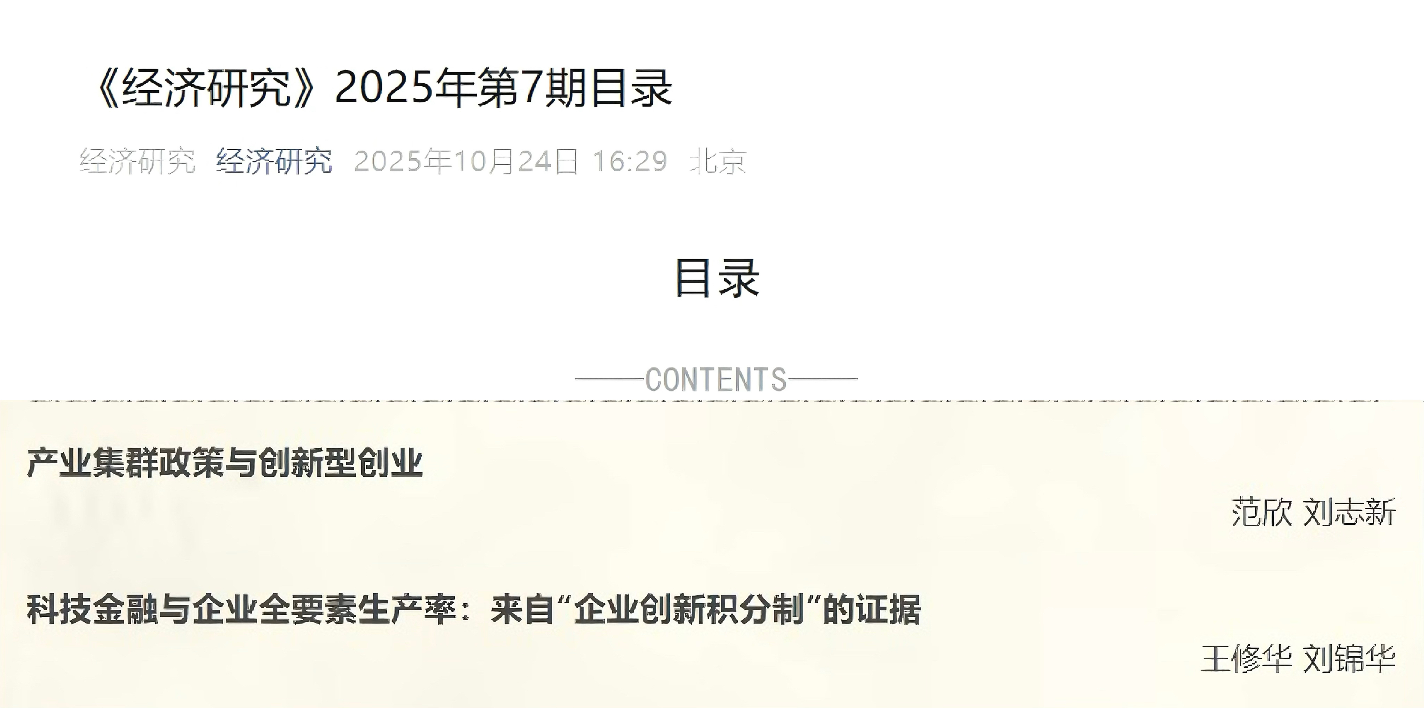 近日,91吃瓜 应用金融系王修华教授和安徽大学经济学院刘锦华老师(原91吃瓜 2020级博士研究生)合作的题为“科技金融与企业全要素生产率:来自企业创新积分制的证据”的论文发表在《经济研究》2025年第7期。