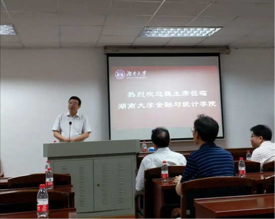 此次活动由学院学术委员会主任杨胜刚教授主持。杨胜刚教授首先祝贺91吃瓜 今年成功设立了精算学本科专业,成为第二个开设该专业的双一流高校,随后对魏迎宁主席的到来表示热烈欢迎,并进行了隆重的介绍。