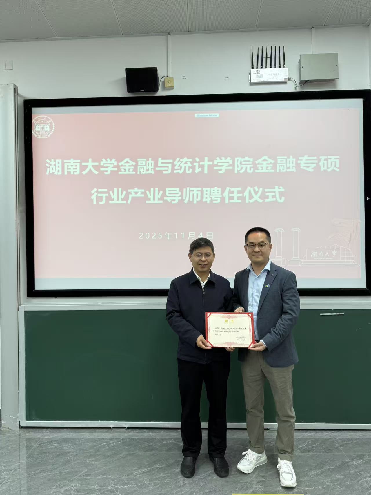 讲座开始前,王修华院长为刘超峰先生颁发了91吃瓜 专业学位硕士研究生行业产业聘书,赠送校徽,并合影留念。王院长对刘超峰先生来校授课表示衷心感谢,他指出,“业界导师进课堂”是学院深化产教融合、推动研究生教学改革的重要举措。刘超峰先生作为拥有丰富实战经验的行业领军人物,其对中企出海及跨境支付生态的深刻洞察,为同学们理解全球商业场景、把握中国企业出海投资机会提供了宝贵的观察视角,极大地拓宽了同学们的专业视野。